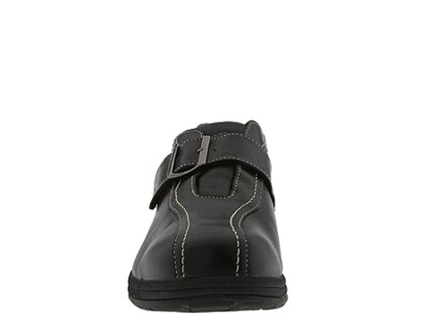 Leather upper with buckle and adjustable strap for a customizable fit.